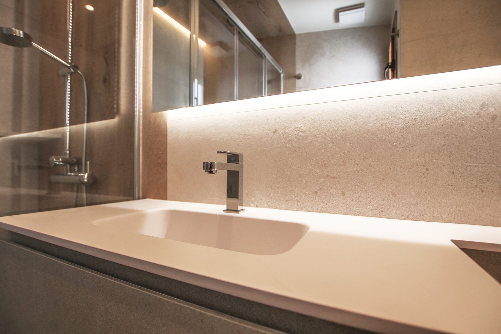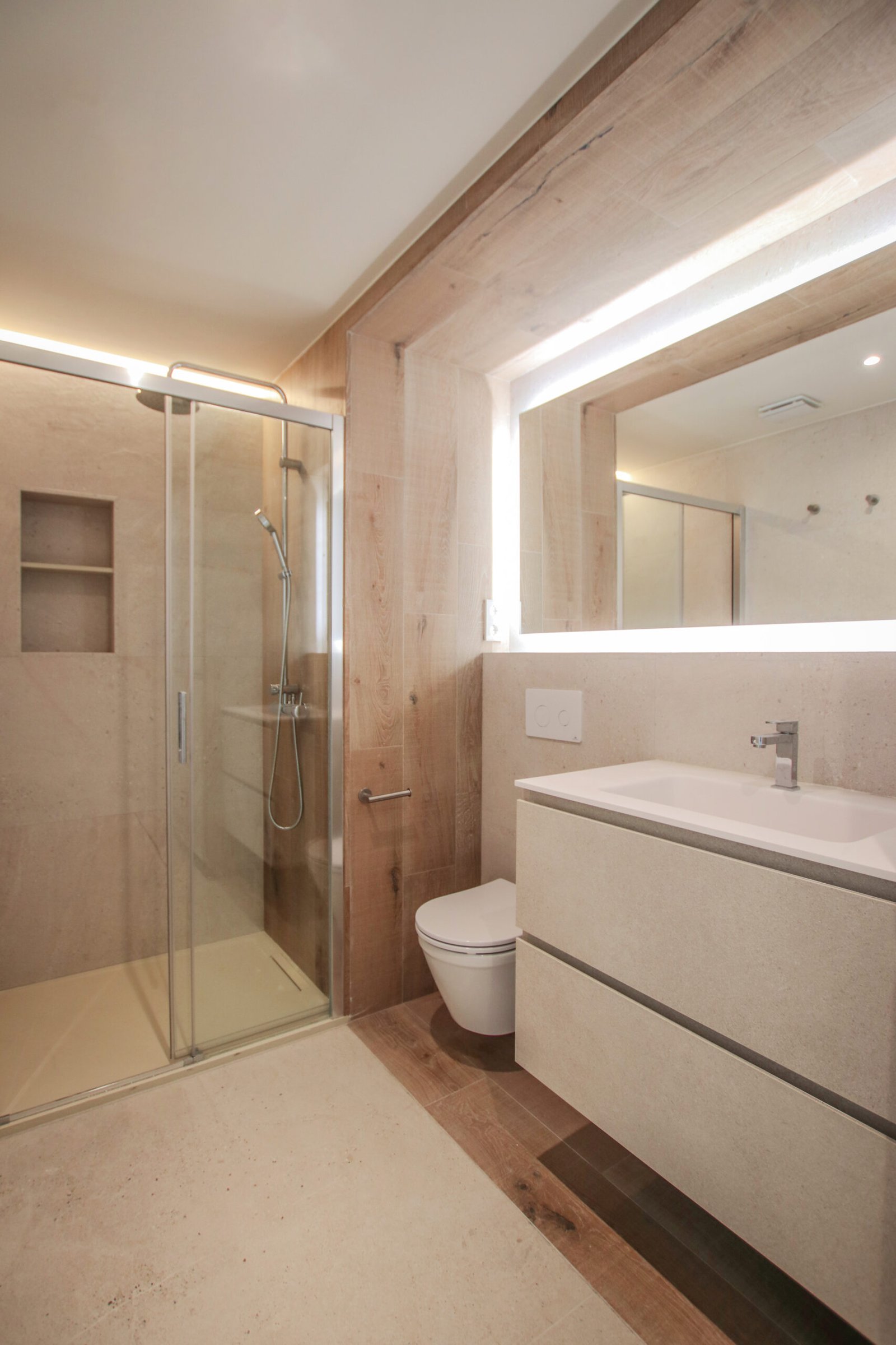 The contemporary kitchen is fitted with high-quality Bosch appliances, including oven, microwave, induction hob and integrated washer-dryer, ensuring both practicality and design continuity. Every element has been selected to create a clean, cohesive space where comfort and style coexist.