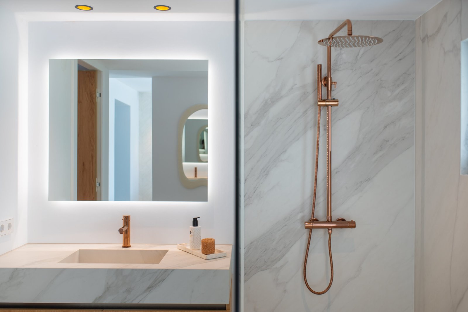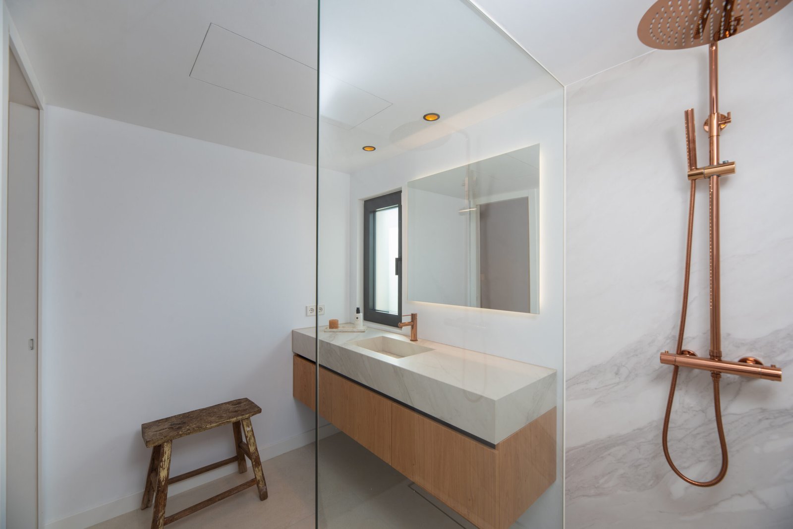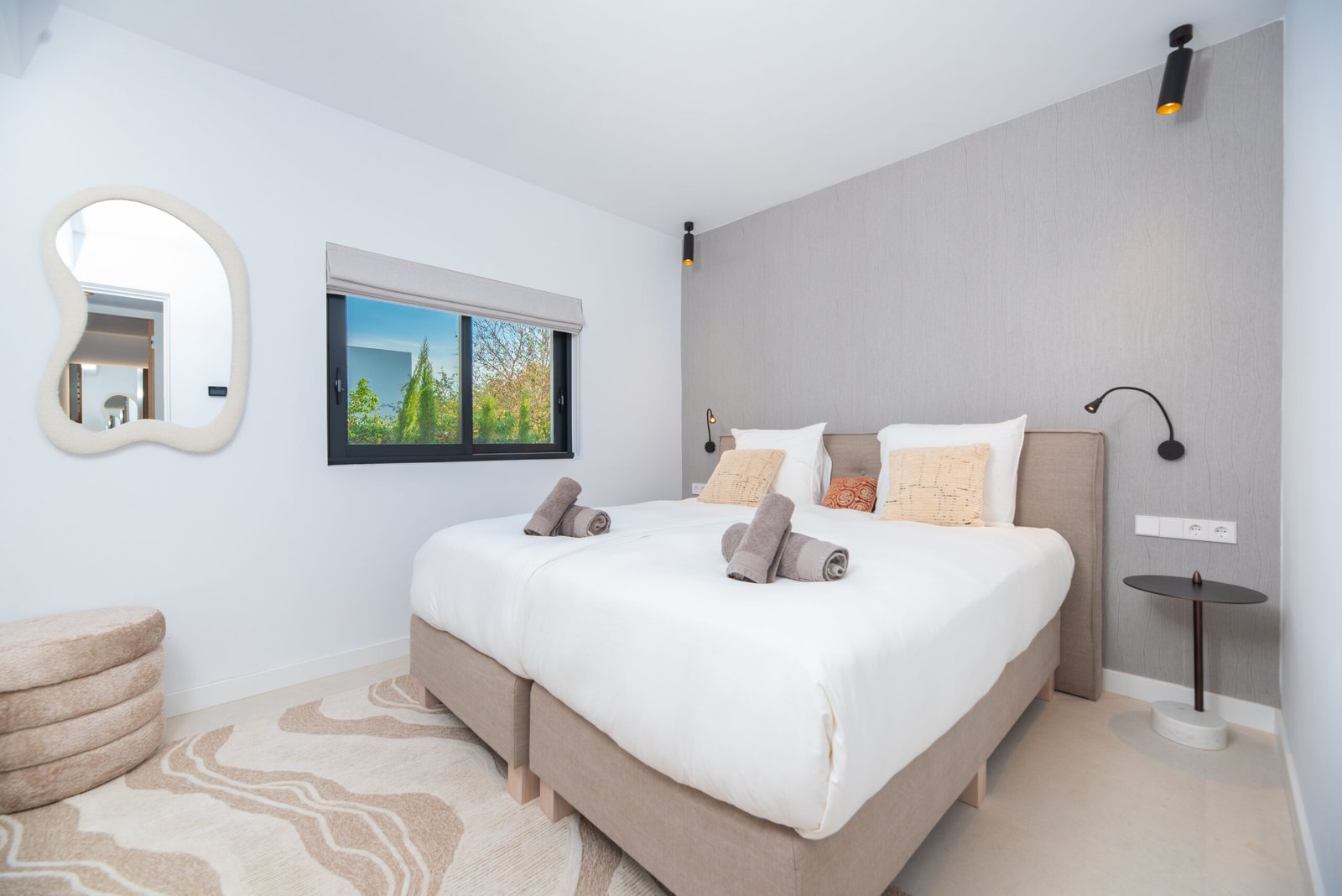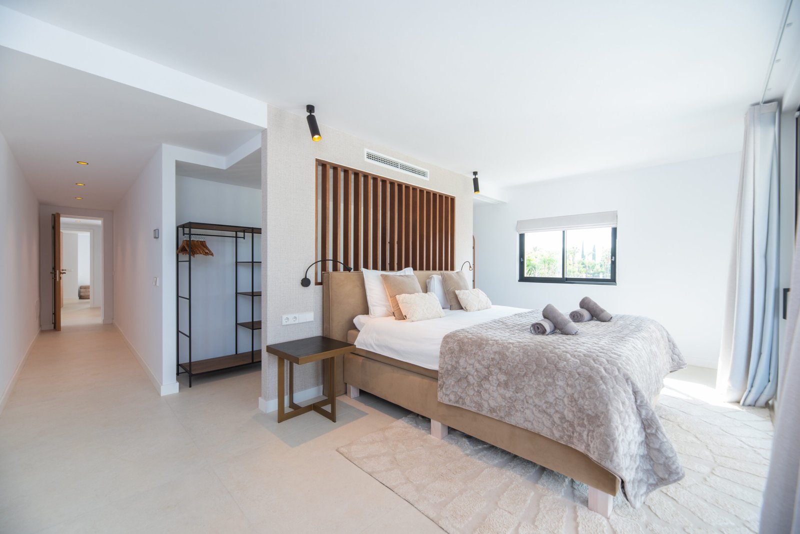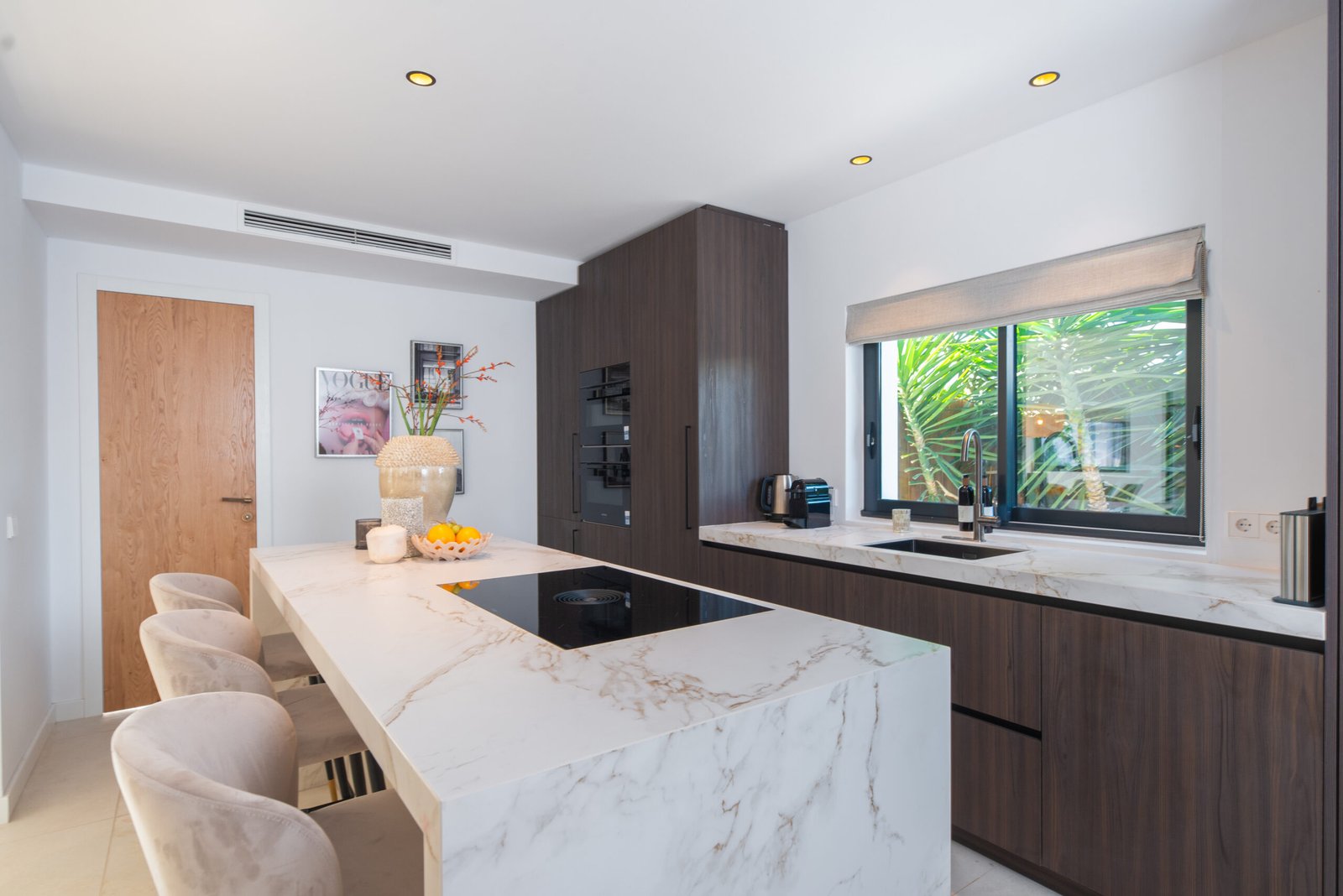 The villa is fully designed for effortless, high end living, where every detail supports both comfort and lifestyle. A private swimming pool sits at the heart of the outdoor area, surrounded by sun loungers, a landscaped garden and multiple lounge and dining spaces that invite long, relaxed days and evenings. A covered terrace extends the living area outdoors, complemented by a built in barbecue and outdoor dining setting ideal for entertaining. Inside, the property offers a fully fitted modern kitchen with a refined marble island, seamlessly connected to the main living space with a fireplace, creating a warm yet sophisticated atmosphere. Each of the five bedrooms is designed with privacy in mind, featuring en suite bathrooms with high quality finishes, while the master suite is elevated by a freestanding bathtub and serene views. Additional features such as underfloor heating, air conditioning, a private garage, alarm system and south facing terraces ensure both comfort and security throughout the year. The villa is fully furnished and ready to move in, offering a turnkey experience in one of Ibiza’s most desirable locations.