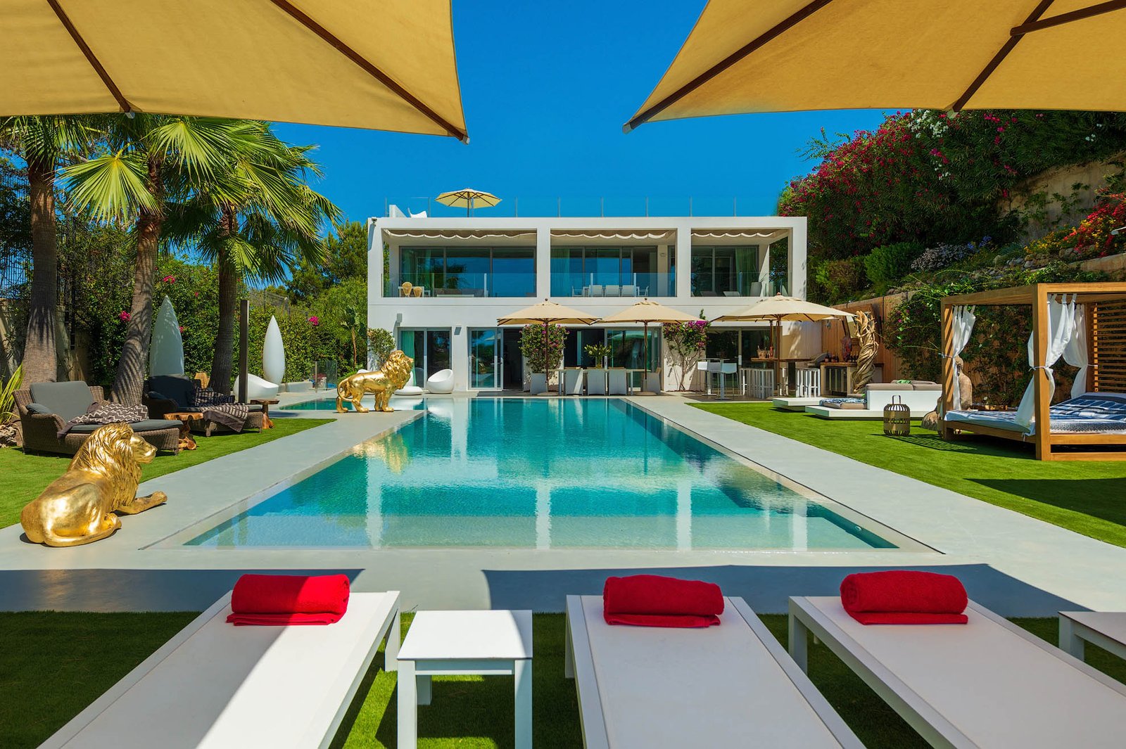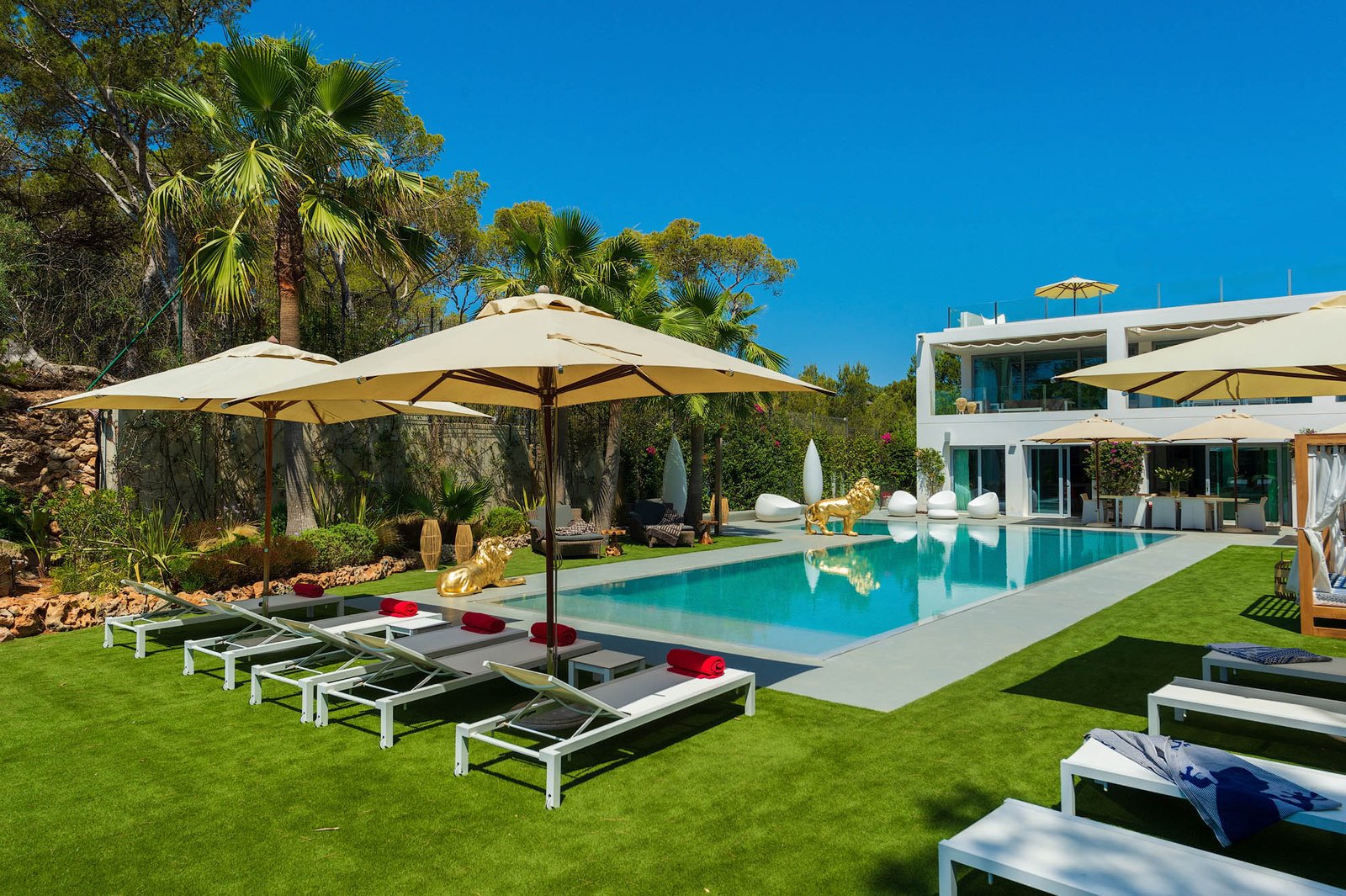The exterior is a defining feature of the home, with an impressive swimming pool surrounded by manicured lawns, palm trees, sun loungers, shaded terraces, and multiple chill-out areas designed for relaxation and entertaining. Large covered terraces with awnings provide elegant outdoor dining and lounge spaces overlooking the garden.