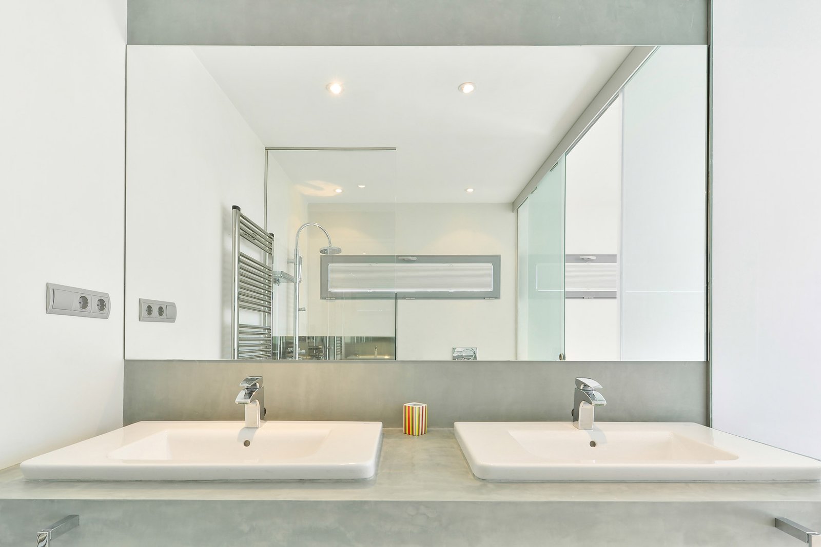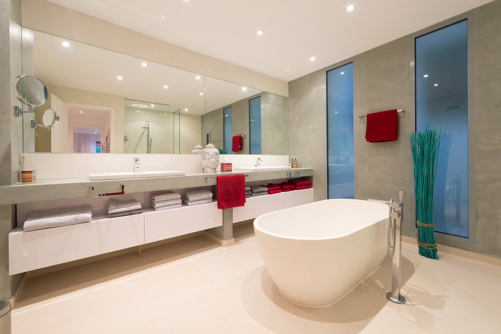 Interior finishes include large-format porcelain tile flooring throughout the home and continuous microcement finishes in the bathrooms. Climate comfort is ensured through ducted air conditioning and underfloor heating across the villa.