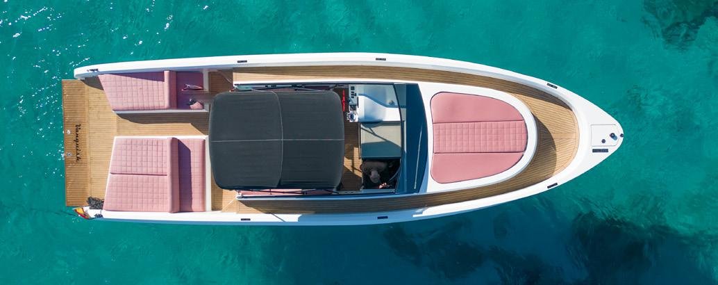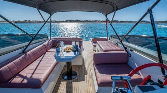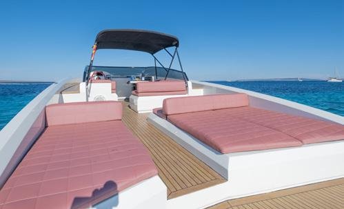 BOLD, FUN AND SEXY Sassy by name, sassy by nature, our “Tequila” fits up to 11 passengers plus crew. Boasting front and back sun beds, an exterior sitting area with sunshade and a bluetooth music connection – not to mention those red cushions – this eyecatcher of a boat is perfect for cruising between Ibiza and Formentera.